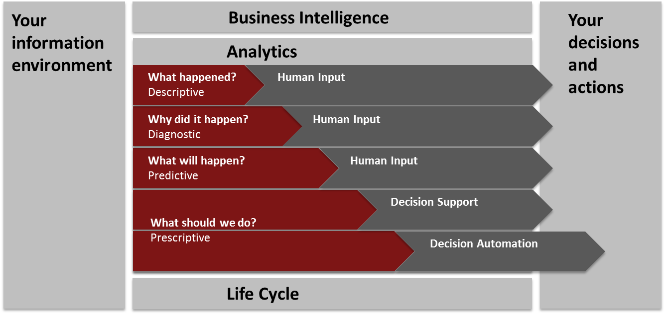 Ihre Entscheidungsfindung wird durch interne und externe Informationen unterlegt. Zeitgerechte Analytik verbessert Ihre Entscheidungsqualität. Ihr Geschäft profitiert von einem zunehmenden Maturitätsgrad der Analytik - von beschreibend zu voraussagend. Die Aufzählung enthält eine Auswahl von Anwendungsfällen: